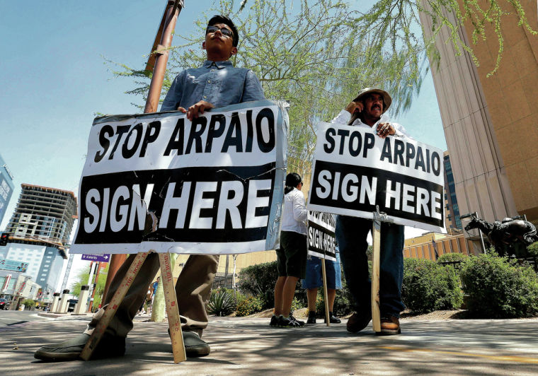 Simon Lopez, left, and Hiliaro Islas hold signs in downtown Phoenix while trying to collect signatures last May in an effort to recall Maricopa County Sheriff Joe Arpaio. Arizona is still widely viewed in Mexico as the most anti-Mexico state in the U.S., even if the tough anti-migrant law behind that perception has been largely voided. But Arizonas leaders are logging lots of miles to put a new face on their home state. Associated Press file photo